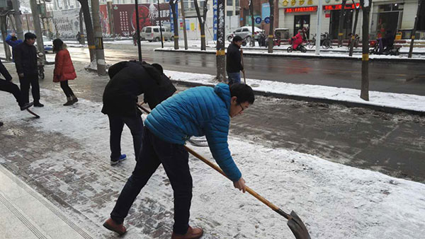 恰逢每年雪天,公司都会自发组织员工扫雪活动,为路过行人铲出一段平整的道路,传承我国劳动光荣的传统美德,今年也不例外,早晨不到八点,公司员工就手持铁锹开始了铲冰与扫雪,不一会儿他们就开始擦汗,替换分工,他们的身影在雪后的朝阳中,形成了一道风景线,路过的行人频频点头,露出和谐的微笑。
